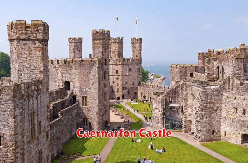 Caernarfon Castle is a magnificent medieval fortress, a UNESCO World Heritage site located in the town of Caernarfon, Gwynedd, North Wales. Built by King Edward I during the late 13th century, it boasts imposing polygonal towers and colorful banded masonry.
