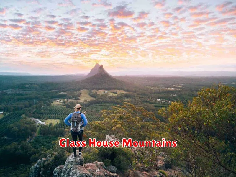 The Glass House Mountains are a cluster of thirteen hills in the Sunshine Coast hinterland of Queensland, Australia. Formed by volcanic activity millions of years ago, these distinctive peaks rise dramatically from the surrounding plains.